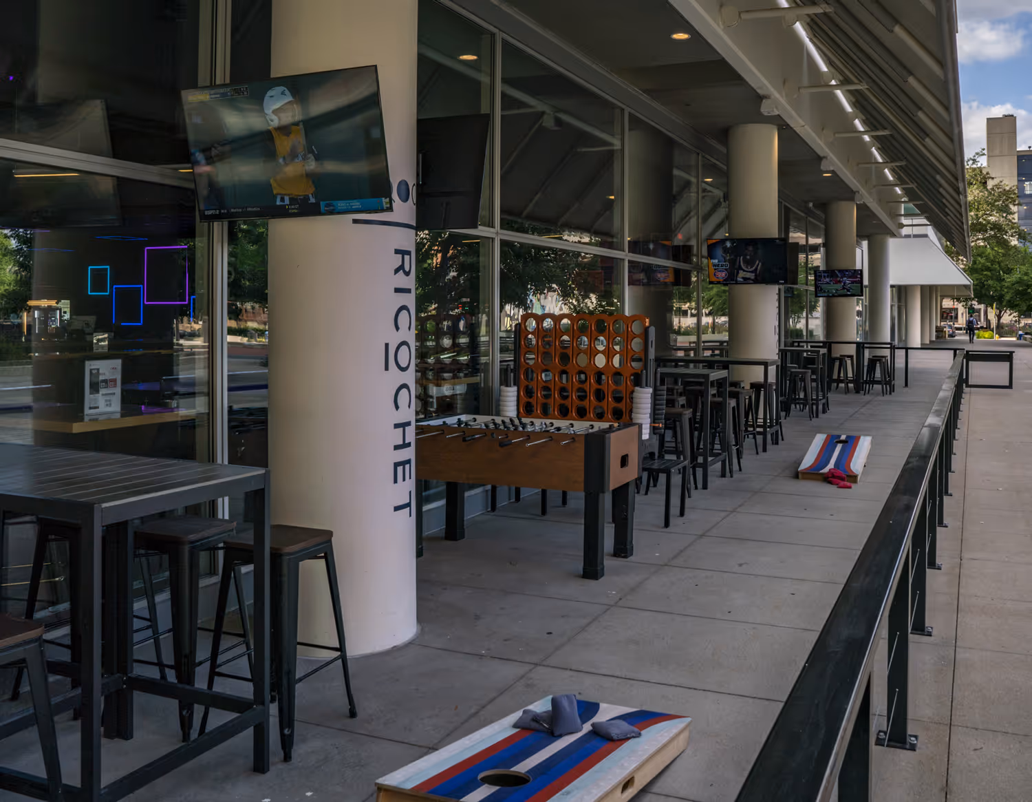 Step up your game at Ricochet’s outdoor patio with an exhilarating round of corn hole!